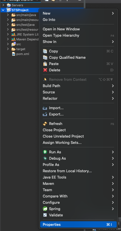 다음으로 JDK의 버전과 Tomcat 설정을 위해서, 생성한 프로젝트를 오른쪽 클릭 -> Properties를 클릭해 준다.