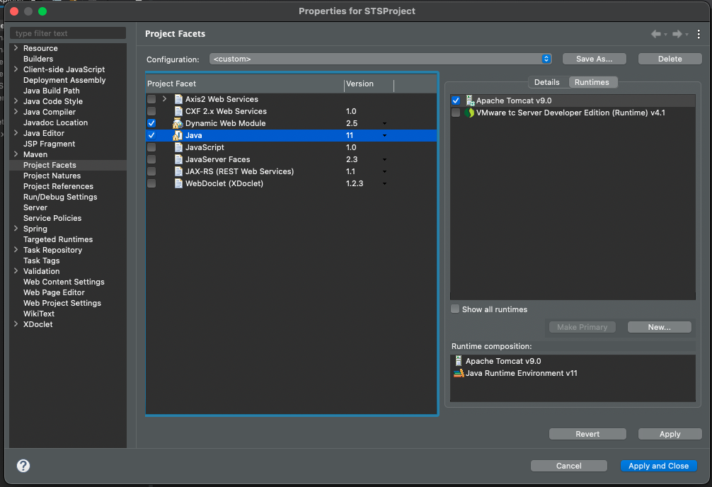 Project Facets -> Java Version을 자신의 버전으로 바꾸어 주고, 그 오른쪽 Runtimes -> Apache Tomcat v9.0을 선택해 준 뒤, Apply and Close 버튼을 눌러준다.