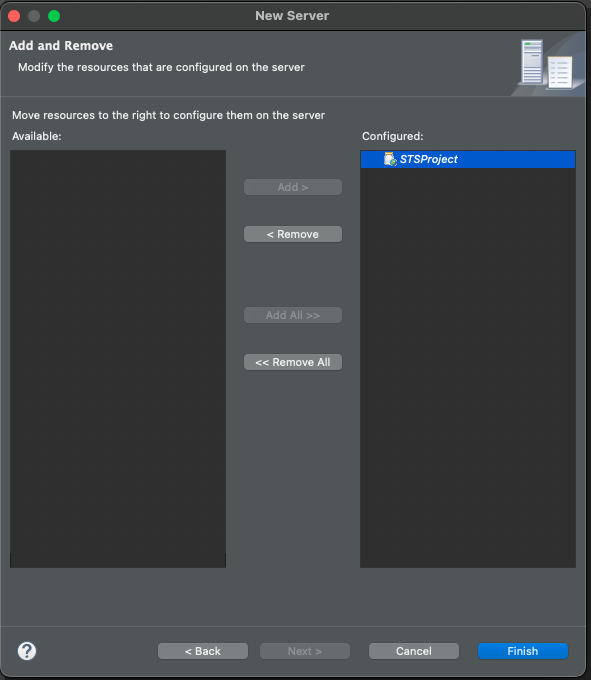 Available에 자신의 프로젝트가 있다면 해당 프로젝트를 클릭하여 Add > 버튼을 눌러 Configured로 옮겨준 뒤, Finish 버튼을 눌러주면 서버도 완료.