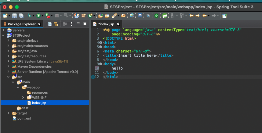 이렇게 하면 설정은 완료가 되었고, 서버가 잘 돌아가는지 확인하기 위해 src -> main -> webapp에 index.jsp 파일을 만들어 hello를 적어보자.