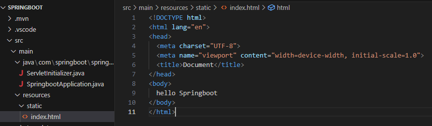 웹브라우저에서 localhost:8081(설정포트)로 이동을 하면 index.html 파일의 body에 적어두었던 hello Springboot가 잘 찍히는 것을 볼 수 있다.