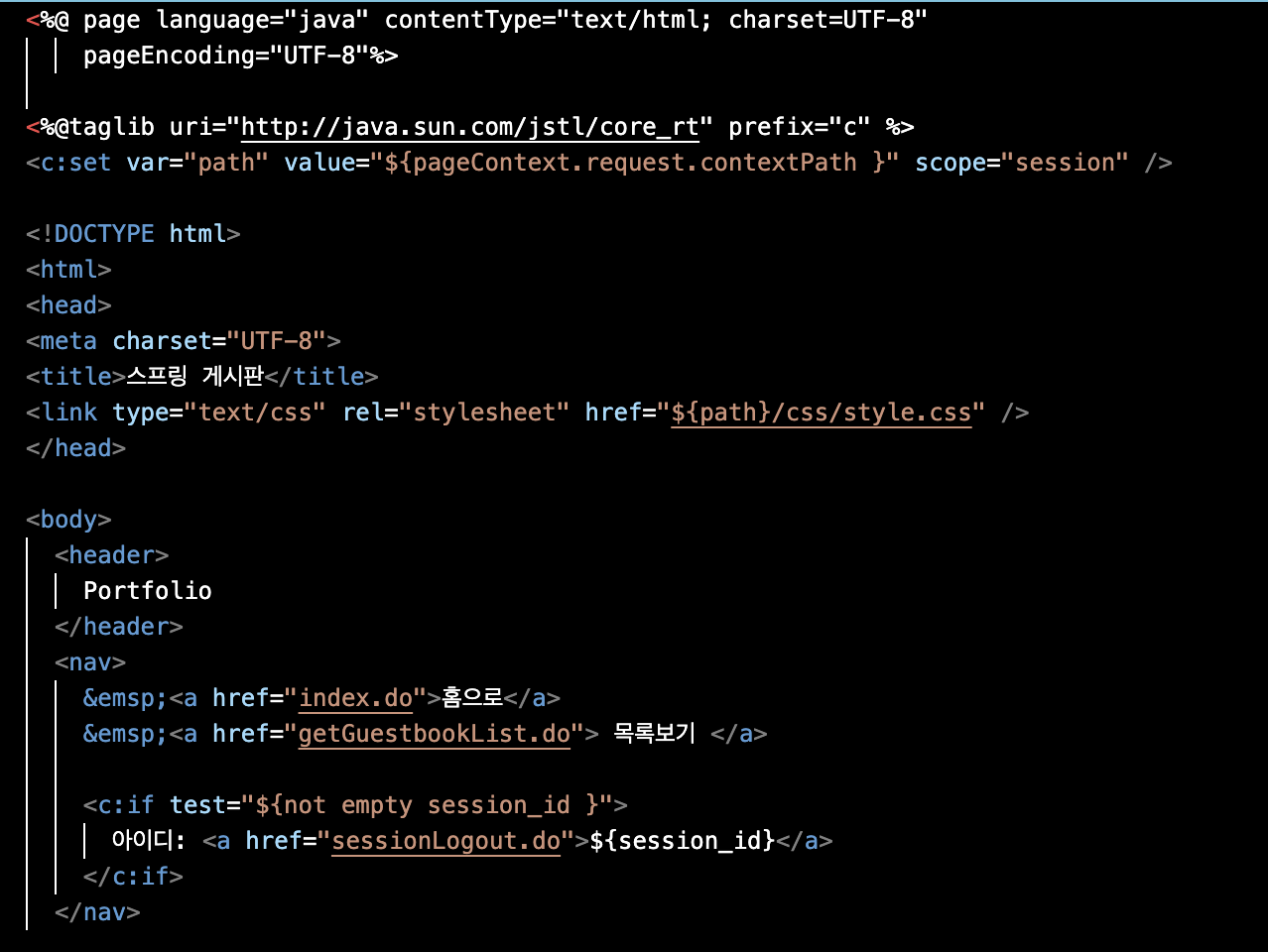 페이지를 편하게 관리하기 위해 view 폴더 안에 include 폴더를 생성하고, top.jsp, bottom.jsp 파일을 생성해주고 index.jsp에서 jstl로 import 해주었다.