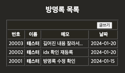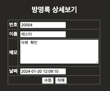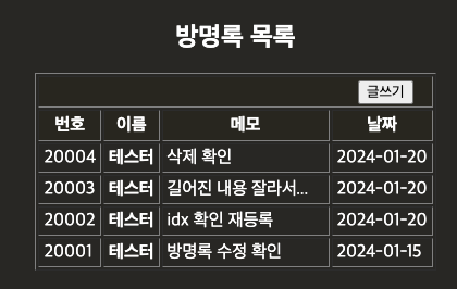 확인 버튼을 누르면 해당 레코드가 잘 삭제된 후 방명록 목록으로 돌아온다.