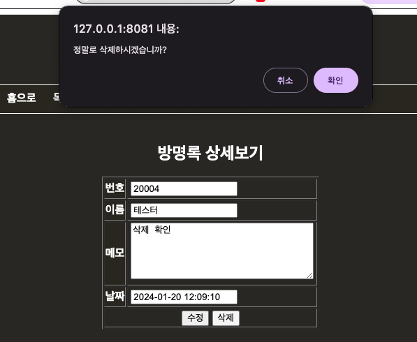 여기에서 삭제를 클릭하게 되면, 이렇게 작성해 놓은 내용의 알람창이 뜨는 것을 확인할 수 있고,