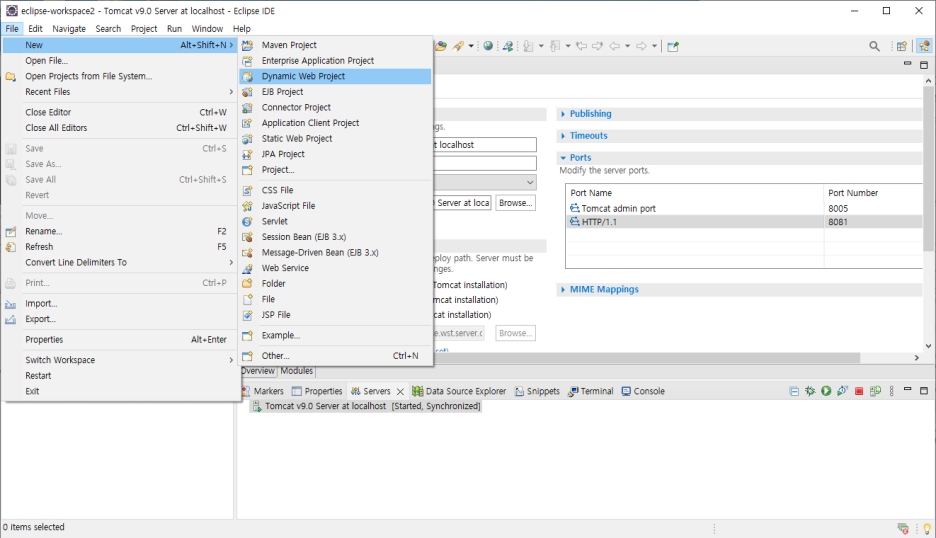 다음으로 메뉴에서 File -> New -> Dynamic Web Project 클릭하여 프로젝트를 생성하자.