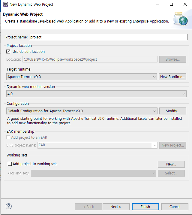 서버 설정이 자동으로 되어 있다면 Proejct name만 입력해 주고 Finish 버튼 클릭.