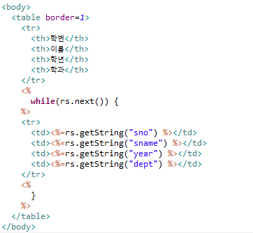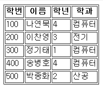 테이블 태그를 활용해서 student 테이블에 있는 결과 값을 찍어 주었다.