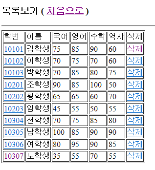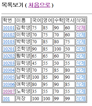 sql = sql + " values ("+ sno +", '"+ sname +"', "+ kor +", "+ eng +", "+ math +", "+ hist +")";