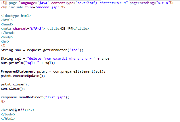 list.jsp에 있는 삭제 버튼을 누르면 sno 값을 함께 넘겨줄 것이고, 파라미터로 해당 레코드의 sno를 받아와 그 레코드를 삭제한다.