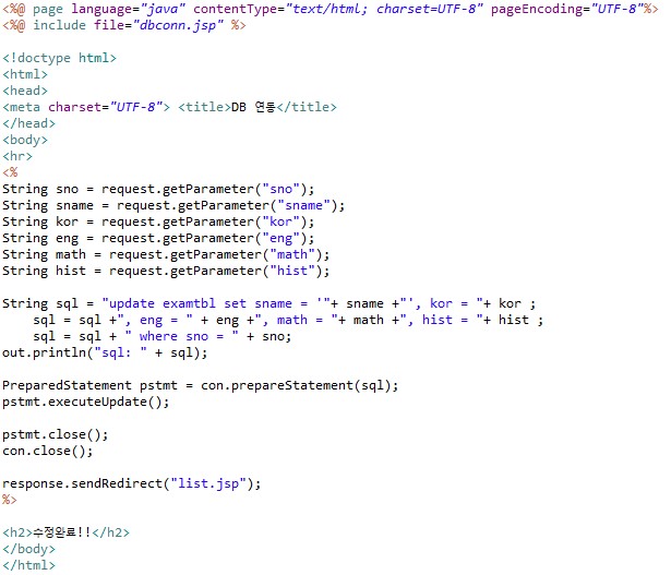 수정하기 버튼을 클릭하면 update.jsp 파일로 이동할 것이고, 파라미터로 넘어온 값들을 받아 update 쿼리로 수정해 준다.
