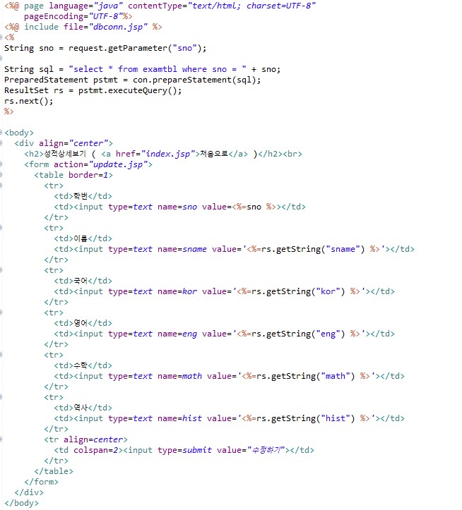 list.jsp 파일에서 학번을 클릭하면 해당 레코드의 학번과 함께 edit.jsp 파일로 이동하게 된다.