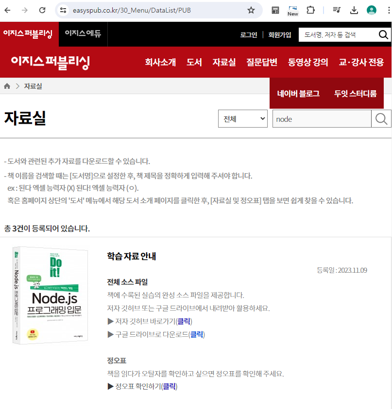 이지스퍼블리싱 홈페이지의 자료실에서 node로 검색을 하면 학습 자료가 있고, 구글 드라이브로 다운로드를 하여 원하는 경로에 폴더를 이동시켰다.