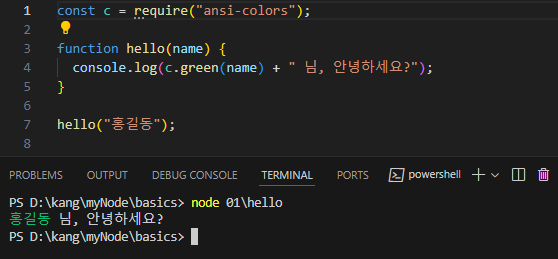 기존 hello.js 파일에서 설치한 ansi-colors 모듈을 가져와 c라는 변수에 할당하고 c.green을 사용해 이름을 초록색으로 표시했다.