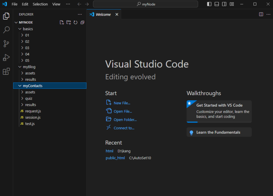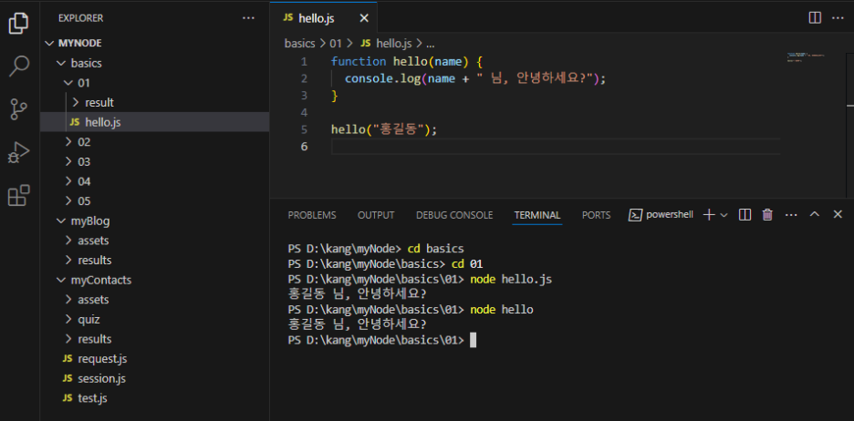 그 중 01 폴더의 hello.js 파일을 열어주고, 실행을 위해 VS Code의 터미널을 열어준다.