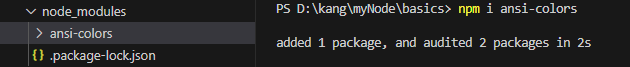 ansi-colors가 잘 설치가 되어 모듈로 추가가 된 것을 볼 수 있다.