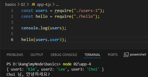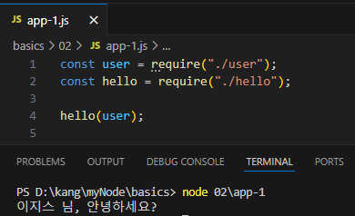 app-1.js 파일을 생성하여 두 모듈을 가지고 오는 require 함수를 사용해준다.