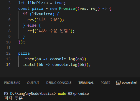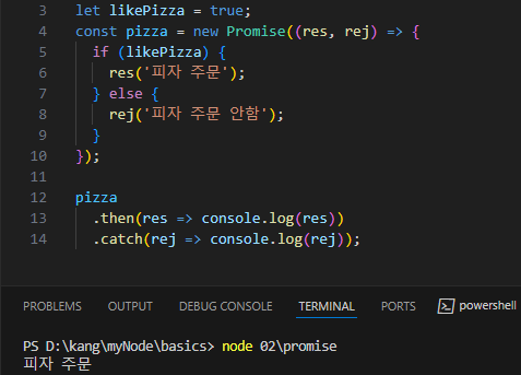피자라는 객체는 new Promise를 사용해서 만든 프라미스 객체이기 때문에 true냐 false냐에 따라 reslove 함수에 있는 결과를 반환하거나 reject 함수에 있는 함수를 반환하는 것.