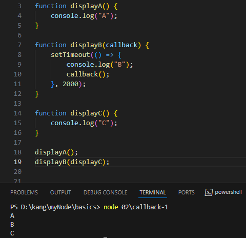 displayB 에서 매개변수인 callback을 받았고 함수에서 그 callback을 실행하는데, 이때 전달한 인수가 displayC이기 때문에 B console.log("B")가 찍힌 이후에 displayC가 실행된다.
