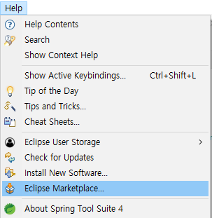 바로 상단바의 Help를 눌러 Eclipse Marketplace로 들어가서 검색 창에 web을 입력했고, 아래에 있는 'Eclipse Enterprise Java and Web Developer Tools' 프로그램을 Install 해주었다.