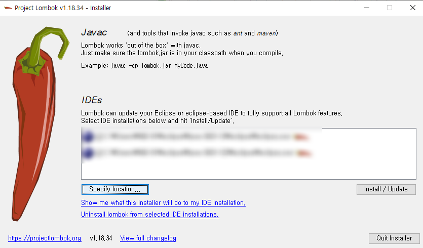 Specify location 클릭하여 롬복을 추가하려는 툴의 .exe 파일이 있는 경로 위치 넣고 Install/Update