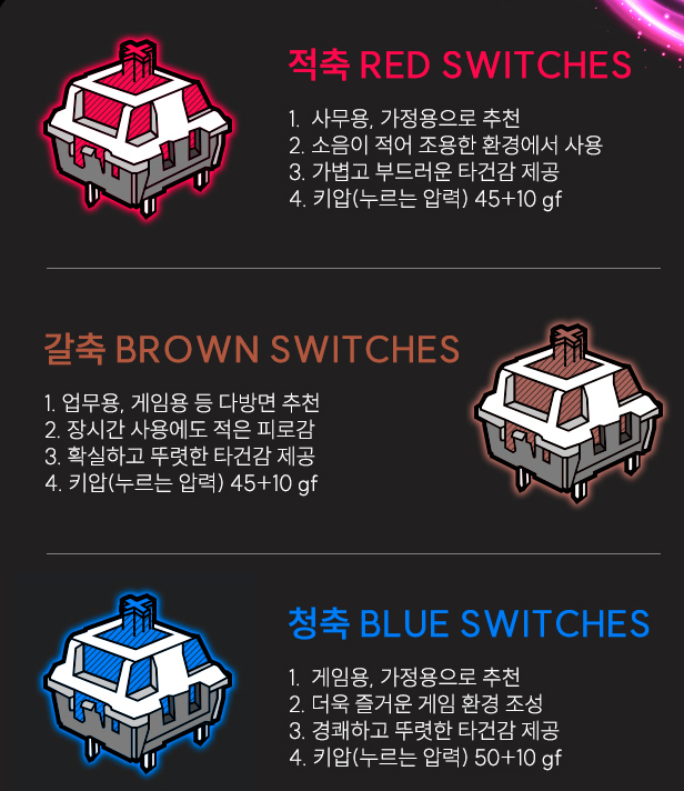 작동 방식 : 기계식 키보드 (적축, 갈축, 청축)