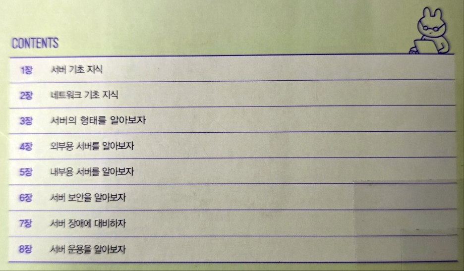 이 책은 서버의 구조에 대해 총 8개의 카테고리로 나누어져 있어서, 하루에 한 카테고리씩 총 8일 동안 이 책을 정리했다.