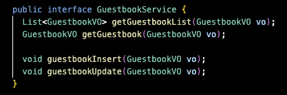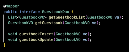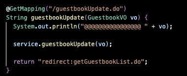 GuestbookController.java 파일에서 guestbookUpdate.do mapping을 해주고, update를 한 후에는 getGuestbookList.do로 이동할 수 있도록 해준다.