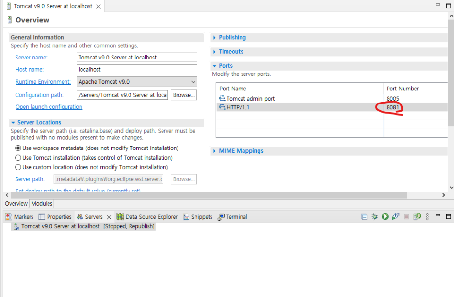 그 외에 HTTP로 되어 있는 port도 오라클 등 다른 port와 겹칠 수 있으니 기존 8080에서 8081 등의 다른 port로 바꿔주었다.