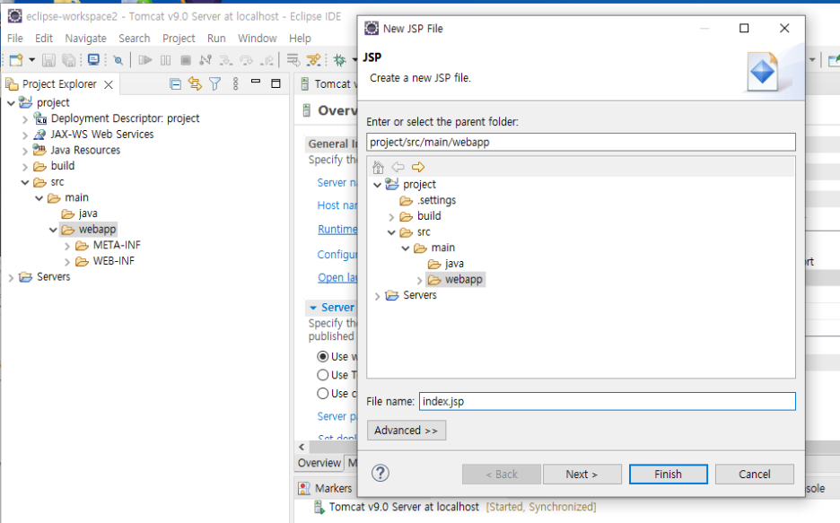 파일 이름을 index.jsp로 입력하고 Finish 클릭.