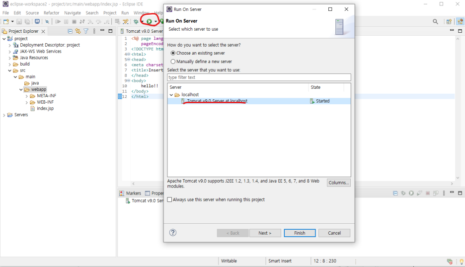 실행 버튼 클릭 후, Server -> localhost -> Tomcat 클릭 후 Finish 클릭.