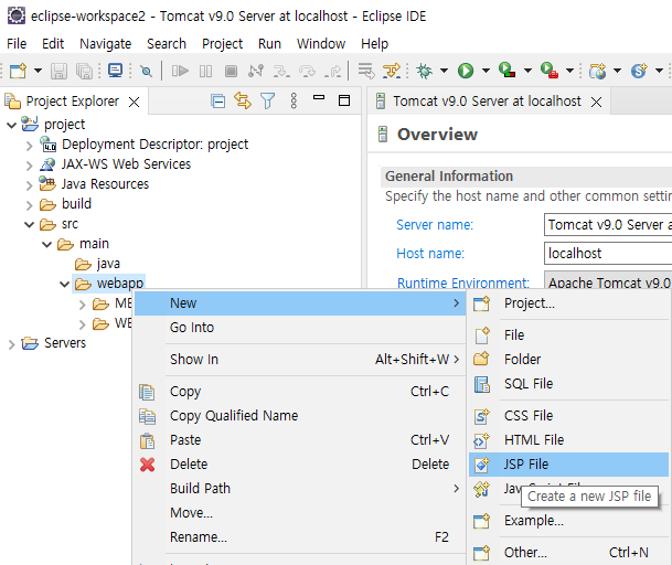 (혹시 JSP File이 없다면 Other -> Web -> JSP File)