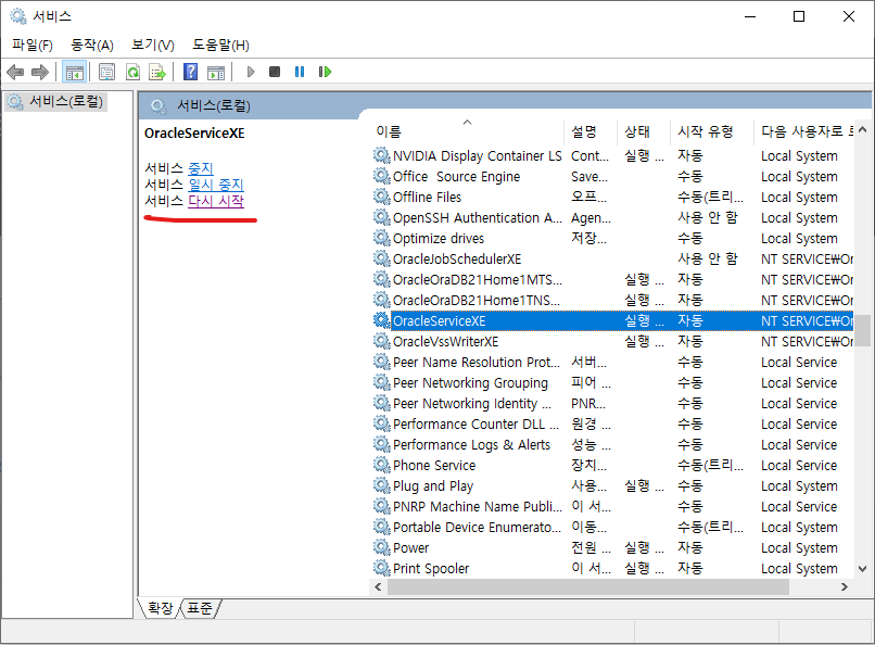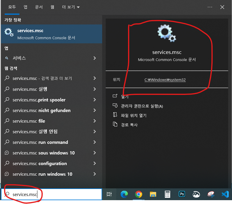 윈도우 버튼 옆 찾기에 'services.msc' 나 '서비스' 입력.