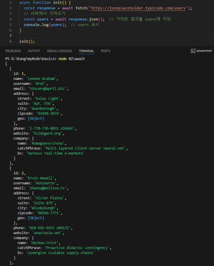 response.json 함수는 서버에서 가져온 프라미스 객체를 프로그램에서 사용할 수 있는 '객체'로 변환하는데, 이 과정도 시간이 걸릴 수 있기 때문에 await를 붙여준다.