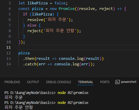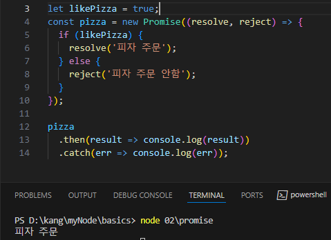 피자라는 객체는 new Promise를 사용해서 만든 프라미스 객체이기 때문에 true냐 false냐에 따라 reslove 함수에 있는 결과를 반환하거나 reject 함수에 있는 함수를 반환하는 것.