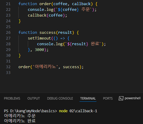 이를 활용하여 커피 주문을 받고 3초 뒤 주문 받은 커피가 완료 되었다는 문구를 출력해보자.