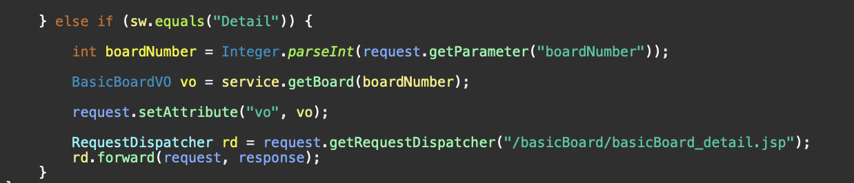jsp에서 받은 boardNumber를 Controller에서 형변환하여 변수 boardNumber에 담아주고, 그 boardNumber를 getBoard에 넣어보내주는 것이고, 그 값을 vo에 담아준다.