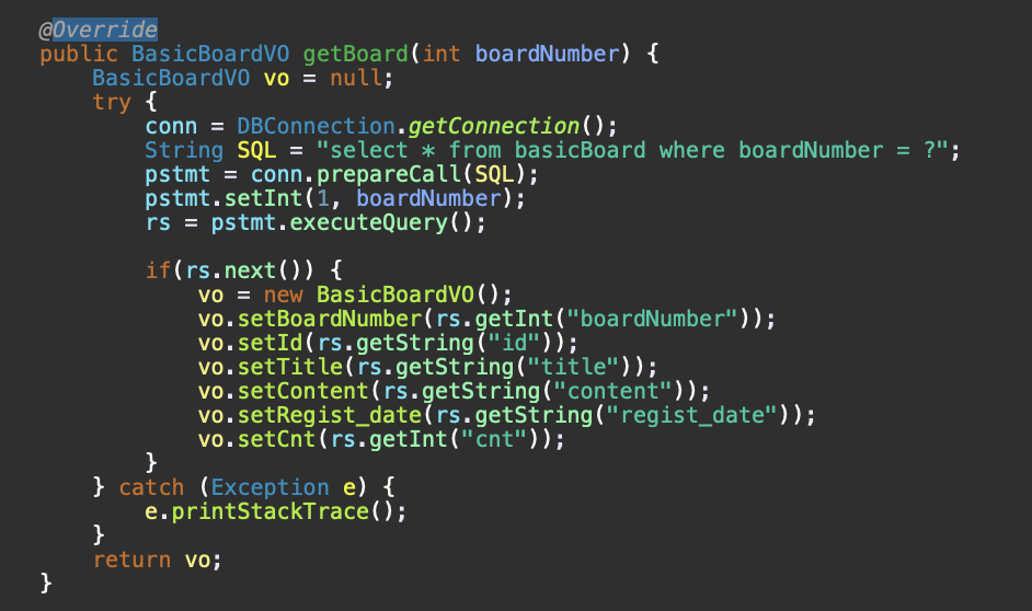 BasicBoardDaoImpl 에서 상속받은 getBoard에 쿼리를 추가해주고, 파라미터로 받은 boardNumber를 pstmt에 넣어준다.